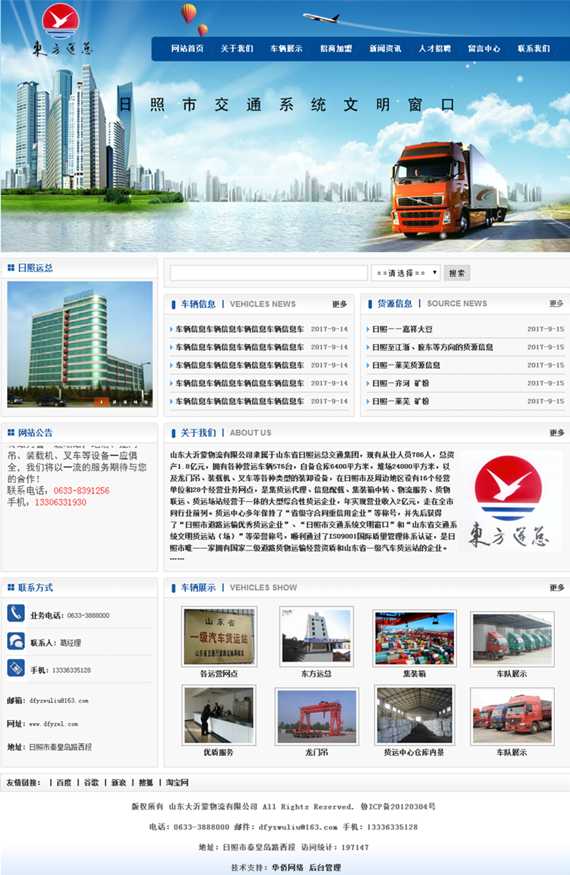 山東大沂蒙物流有限公司隸屬于山東省日照運(yùn)總交通集團(tuán),現(xiàn)有從業(yè)人員786人,總資產(chǎn)1.8億元,擁有各種營(yíng)運(yùn)車輛576臺(tái),自備倉(cāng)庫(kù)6400平方米,堆場(chǎng)24000平方米,以及龍門吊、裝載機(jī)、叉車等各種類型的裝卸設(shè)備,在日照市及周邊地區(qū)設(shè)有16個(gè)經(jīng)營(yíng)單位和28個(gè)經(jīng)營(yíng)業(yè)務(wù)網(wǎng)點(diǎn),是集貨運(yùn)代理、信息配載、集裝箱中轉(zhuǎn)、物流服務(wù)、貨物聯(lián)運(yùn)、貨運(yùn)場(chǎng)站經(jīng)營(yíng)于一體的大型綜合性貨運(yùn)企業(yè),年實(shí)現(xiàn)營(yíng)業(yè)收入2億元,走在全市同行業(yè)前列。貨運(yùn)中心多年保持了“省級(jí)守合同重信用企業(yè)”等稱號(hào),并先后獲得了“日照市道路運(yùn)輸優(yōu)秀貨運(yùn)企業(yè)”、“日照市交通系統(tǒng)文明窗口”和“山東省交通系統(tǒng)文明貨運(yùn)站(場(chǎng))”等榮譽(yù)稱號(hào),順利通過了ISO9001國(guó)際質(zhì)量管理體系認(rèn)證,是日照市唯一一家擁有國(guó)家二級(jí)道路貨物運(yùn)輸經(jīng)營(yíng)資質(zhì)和山東省一級(jí)汽車貨運(yùn)站的企業(yè)。